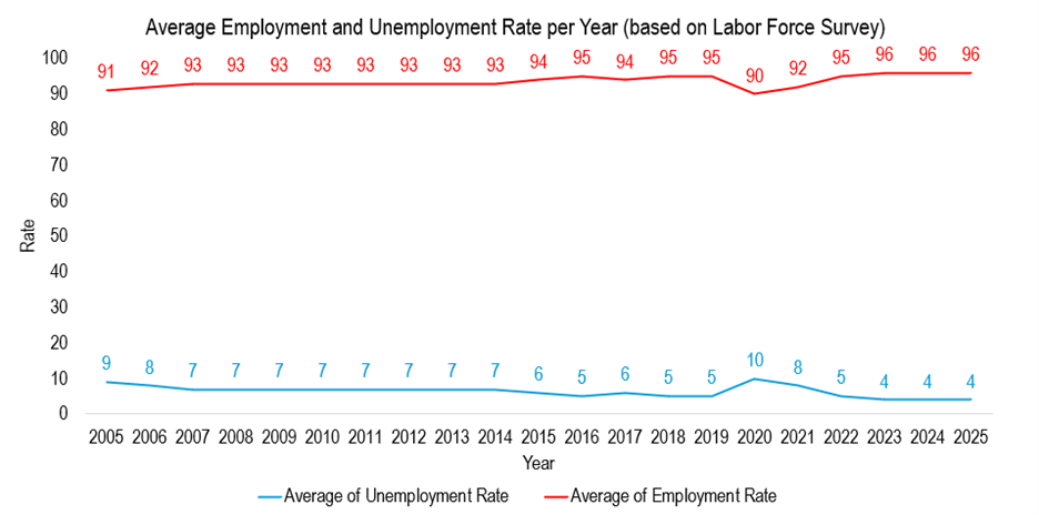 Recovering from the impact of the pandemic, the country was able to revert its employment rate, which stood between 96% ⎻ 97% in 2024. Correspondingly, the unemployment rate declined from a pandemic high of 18% to 4%.