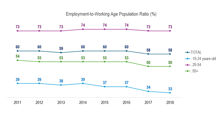 - ➣ Demographic Cornerstone: The 25 – 54 age group is the most employed demographic, consistently maintaining a high employment-to-working age population ratio (73% in 2018).
