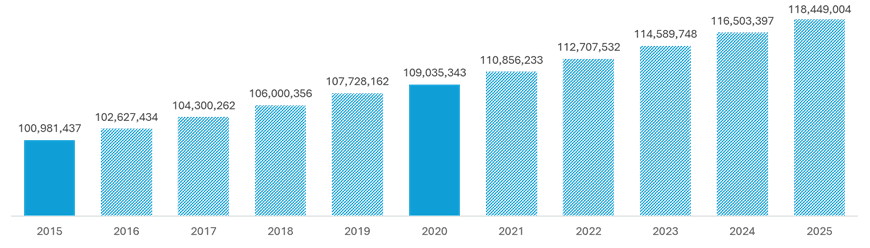 The 2020 Census of Population and Housing showed that the country recorded 109 million individuals[1], projected to reach 118.4 million by 2025. That said, the Philippine population has been steadily increasing at a rate of 1.63% annually since 2015.