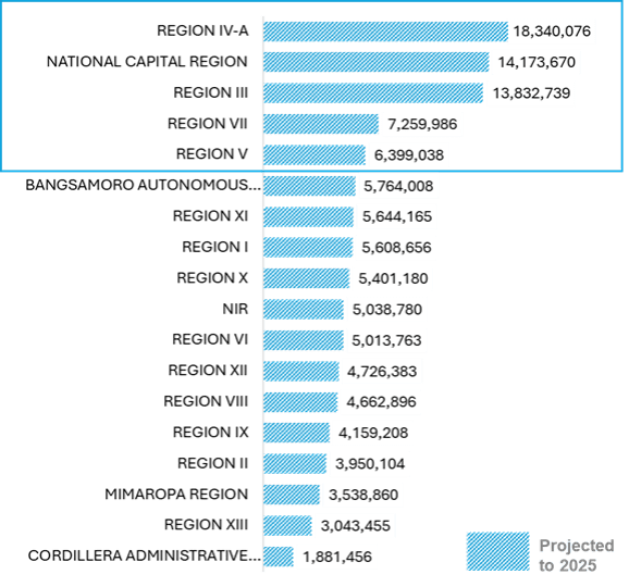 Across the regions, CALABARZON (Region IV-A) remains the most populated, accounting for 15% of the total population, followed by the National Capital Region (NCR) with 12%[4]. The top five regions combined already represent about half of the total Philippine population — approximately 60 million Filipinos projected by 2025.