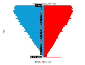 Gender balance remains relatively even across most age groups, women just slightly outnumber men in the senior population. The country’s age pyramid remains triangular, indicating once again a younger demographic profile.