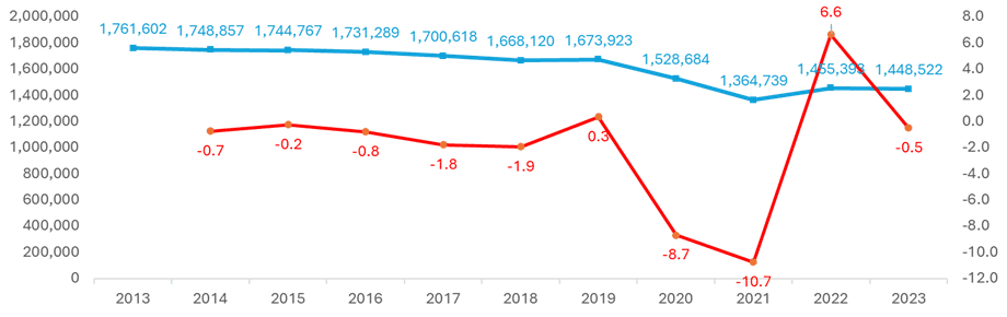 Despite the overall population growth, a decline in live births in the country has been recorded at an average rate of -1.8% per year from 2013 to 2023[5]. Its downward trend became more pronounced during the COVID-19 pandemic, dropping sharply by -8.7% in 2020 and -10.7% in 2021.