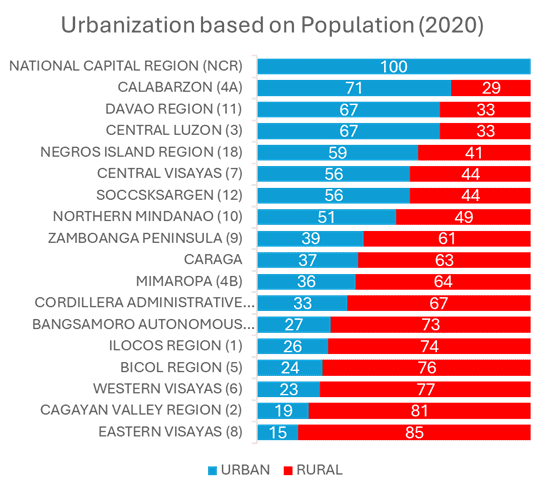 - ➣ Regional Concentration: The National Capital Region (NCR) and CALABARZON (Region IV-A) have the highest percentage of urbanization in terms of population.